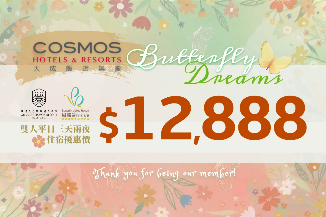 持本券可享瑞穗天合國際觀光酒店-城堡精緻客房+天成逸旅 蝴蝶谷-會館精緻客房 平日雙人住宿三天二夜優惠價$12,888起