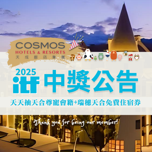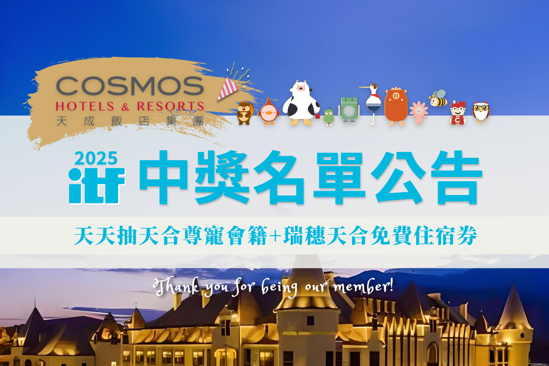 新會員專屬抽抽樂中獎啦!恭喜以下會員獲得天合尊寵卡一年會籍+瑞穗天合免費住宿券